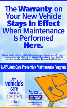 The NAPA AutoCare Peace of Mind Warranty is a written warranty that covers parts and labor for 24 months/24,000 miles, honored at more than 14,000 NAPA AutoCare locations nationwide.